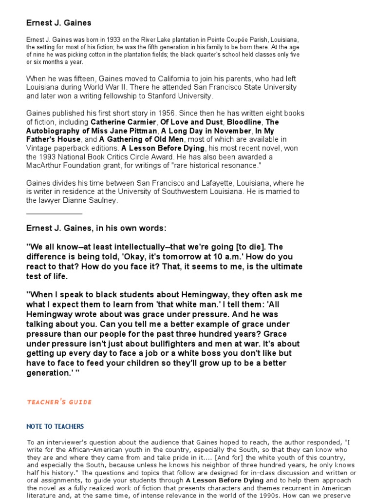 Gaines Introduction The book is set in Bayonne in the 1940s. Product details ASIN. A Lesson Before Dying Vintage Books 1993 Ernest J.